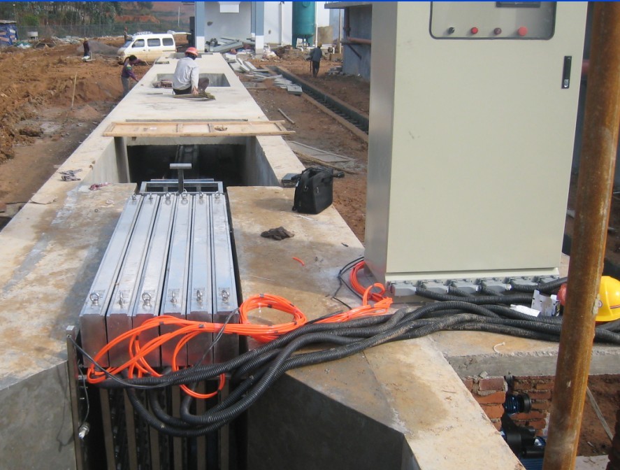 電子鎮流器模塊與跨明渠接線箱相連,接線箱配電受中央控制柜輸送給每個紫外消毒模塊的電源。